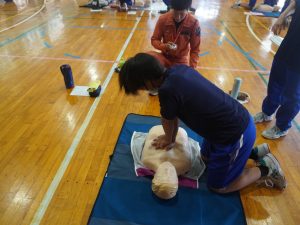 保健体育の授業で、阿南病院や阿南消防署等の方をお招きし、BLSの講習を受けました。BLSとは「Basic Life Support(一次救命処置)」の略で、心臓マッサージやAEDの使い方を学びました。万が一の時には1分1秒が生死の境目。後遺症の有無にも大きく影響します。汗だくになりながら、心臓マッサージを熱心に行う姿が見られました。